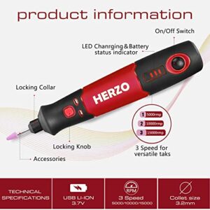 HERZO Mini Multifunktionswerkzeug 3.7V mit Li-Ion Akku, 3 Drehzahleinstellungen und 32 Zubehöre in Rot für kreative Projekte und Heimwerkerarbeiten.