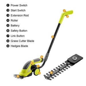 DEWINNER Akku Strauch- und Grasschere Li-ion 7.2V (1.5Ah) mit 2 Aufsätzen und Teleskopstiel. Austauschbare Klingen für Rasenkanten- und Strauchschnitt.