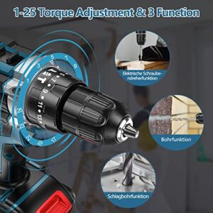 Akkuschrauber 21V, Bohrschrauber mit 2 Batterien 21V, Bohrer mit 3 Funktionen, Schlagbohrschrauber 61tlg Zubehör, AkkuBürste Reinigen Set, Akku Bohrmaschine