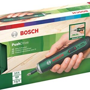 Bosch Ergonomischer Akkuschrauber PushDrive mit 32 Schraubendrehern und Aufbewahrungsbox, eingebauter 3,6-V-1,5-Ah-Akku und Micro-USB-Aufladung.