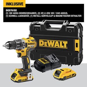 DeWalt Akkuschrauber (18V, 2.0 Ah, bürstenlos, 2-Gang-Vollmetallgetriebe, 15 Drehmomentstufen, inkl. 2 XR Akkus, System-Schnellladegerät und Tstak-Box), DCD791D2