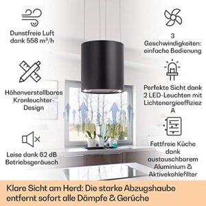Klarstein Inselhaube, Umluft, Leise Abzugshaube für Kochinsel, Aktivkohlefilter, Freihängend Kronleuchter-Design, 3 Stufen mit Filter, 558m³/h Luftstrom.