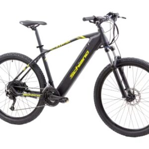 F.lli Schiano E-Jupiter 27.5 Zoll E-Bike, MTB mit 250W Motor und 27-Gang-Getriebe in Schwaz-Gelb.