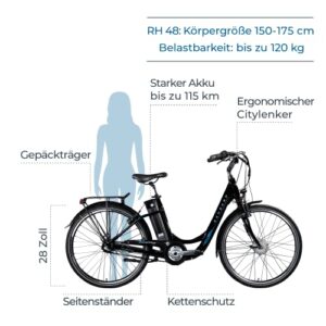 ZÜNDAPP Green 2.7 28″ E-Bike Damen mit Rücktrittbremse, City Hollandrad, Pedelec, tiefer Einstieg, Retro-Design (schwarz/blau, 48 cm)