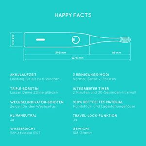 happybrush® E-Schall-Zahnbürste Eco VIBE 3 für Kinder ab 8 J. – nachhaltige Zahnbürste mit 6 Wochen Power-Akku, 3 Aufsteckbürsten & Zahnpasta – Gelb