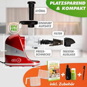 Nutrilovers Slow Juicer MINI-PRESS für Singles & Kleine Küchen, DEUTSCHE MARKE inkl. Rezeptbuch, Nutri-App & Trinkflasche. Obst Gemüse Entsafter elektrisch, BPA-Frei & Spülmaschinenfest.