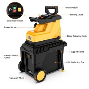 Elektrischer Garten-Häcksler 2800 W Silent Electric mit 55 l Fangkorb, max. Schnittleistung 45 mm, verstellbarer Größe und Transportrad in Gelb.