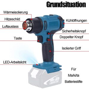 Akku Heißluftpistole 1200W Ersatz für Makita mit 2 Temperaturstufen (300°/550°), Überhitzungsschutz und 2 Düsen. Inklusive 5000mAh Akku und Ladegerät – ideal für Heimwerker und Wärmebehandlung.