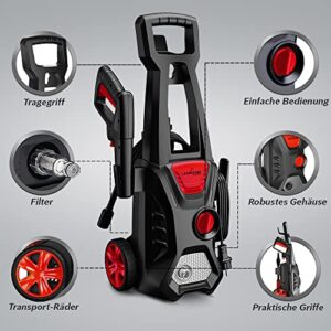 Hochdruckreiniger LEHMANN Jukon 200 Bar 1600 W mit Zubehör: Hochdruckschlauch, Wasserpumpe, Schaumsprüher, kontaktloses Waschen, Terrassenbürste und Turbo rotierende Düse.
