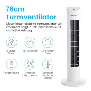 Pro Breeze Turmventilator mit 70° Oszillation, 3 Geschwindigkeitsstufen, Fernbedienung und Timer, 79 cm Höhe, Weiß