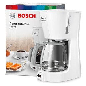 Bosch Filterkaffeemaschine CompactClass Extra TKA3A031, Aromaschutz-Glaskanne, 1,25 L, 10-15 Tassen, Warmhaltefunktion, Abschaltautomatik, Tropfstopp, schwenkbarer Filterträger, 1100 W, weiß.