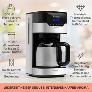 Klarstein 1,2 L Kaffeemaschine mit Thermoskanne und Timer, Filtermaschine für 12 Tassen, 800 W, Edelstahl-Thermoskanne.