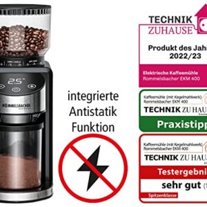 ROMMELSBACHER Kaffeemühle EKM 400 – Kegelmahlwerk, Antistatik-Funktion, 12 Portionen, Halterung für Siebträger, Mahlgrad in 35 Stufen, Bohnenbehälter 220 g, Pulverbehälter, 130 Watt, Schwarz/Edelstahl