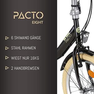 PACTO-Eight Faltrad 27cm Stahlrahmen 20 Zoll Alufelgen 6 Gang Shimano Umwerfer Klapprad Zusammenklappbares Kompaktrad für Erwachsene (SCHWARZ)