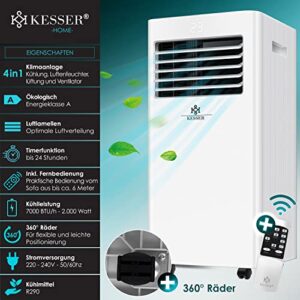 KESSER® – Mobiles Klimagerät 4in1 – 7000 BTU/h (2.000 Watt) 2,3KW – mit Montagematerial, Fernbedienung, Timer und Nachtmodus