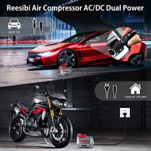 Reesibi Elektrische Luftpumpe für Auto, Fahrrad, Bälle – Dual Power 12V DC/230V AC, inkl. Adapterset, Werkzeugtasche, Digitaler Anzeige, LED-Leuchte – Mini Kompressor 230V Max. 10,3bar
