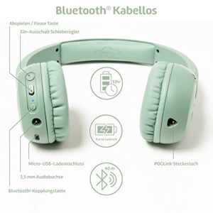 POGS Bluetooth Kinder-Kopfhörer „The Gecko“ – Faltbar, robust, ab 3 Jahren – Lautstärkeregler, Mikrofon, Begrenzer 85 dB – Musik-Sharing Funktion (grün-kabellos)