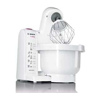 Bosch Küchenmaschine MUM4 MUM4657, 3,9 L Kunststoff-Schüssel, Fleischwolf, Mixer, Zubehörhalter, Knethaken, Edelstahl Schlag- und Rührbesen, 4 Stufen, Durchlaufschnitzler, 4 Scheiben, 500 W, weiß/rot
