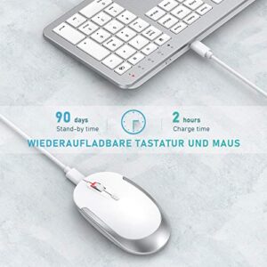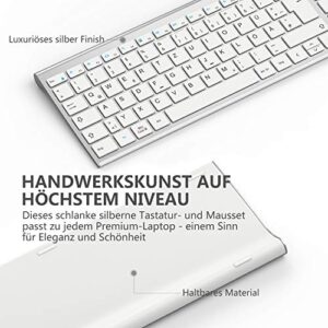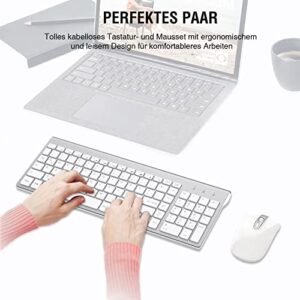 Kabelloses Tastatur-Maus-Set von seenda, ultra-dünn und wiederaufladbar, ergonomisch mit Silikon Staubschutz für PC/Laptop/Smart TV, QWERTZ Layout in Weiß/Silber.