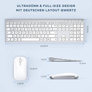 Ultraslim Tastatur und Maus Set, Fullsize Design, Wiederaufladbar, QWERTZ Layout, 2.4G Kabellose Tastatur mit Funkmaus, Weiß/Silber, für PC/Laptop/Smart TV, Windows-Gerät.