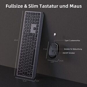 Seenda 2.4G Tastatur Maus Set, Kabellos Beleuchtet, Wiederaufladbar, Fullsize Tastatur und Maus, Weiße Beleuchtung, Große Entertaste, Windows PC/Computer/Laptop/Smart TV, QWERTZ, Grau.