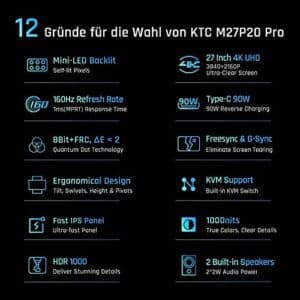 KTC 27″ Mini LED Gaming Monitor, 4K-Auflösung, 160Hz, 1ms, HDR1000, Freesync & G-sync, HDMI2.1, DP1.4, Type-C 90W, M27P20 Pro.