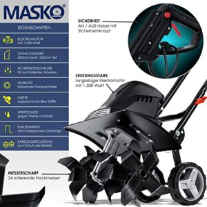 MASKO® Elektro Motorhacke 1500W | 40cm Breite, 20cm Tiefe | Boden- & Ackerfräse | Garten Kultivator | klappbarer Griff | Metallgehäuse | Transporträder