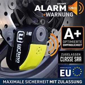 URBAN UR10 Bremsscheibenschloss mit Alarm, Motorrad/Roller/Scooter Schloss, Bremsscheibenschloss Alarm 120dB und Vorwarnung, Motorradschloss mit Alarm, Sicherungsstift 10mm.