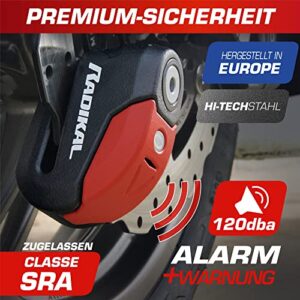 RADIKAL RK10 Motorrad Bremsscheibenschloss mit Alarm, Gehärteter Stahl, Doppelverriegelung SEK DISCTECH, Hochwertiges Alarmsystem mit Warnung, LED-Licht 10mm