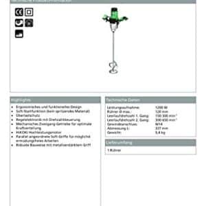 Meister Rührwerk 1400W, MRW1400-2B-M14, 2-Gang-Getriebe, Softstart, elektronische Drehzahlregulierung, bis 120L Mischgut, Handmischer für Farbe, Putz & Estrich, Mörtelrührer, 5451940.