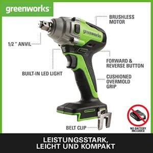 Greenworks GD24IW400 Akku Schlagschrauber, bürstenloser Motor, 0-2800 U/min, 0-4000ipm, 400Nm Drehmoment, 1/2″ Adapter, ohne Akku & Ladegerät, 3 Jahre Garantie.