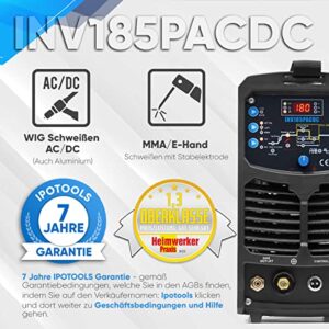 IPOTOOLS INV185PACDC WIG Schweißgerät – 180A Volldigitales Inverterschweißgerät mit HF-Zündung, Pulsfunktion, Aluminium Schweißen, MMA, IGBT und 7 Jahren Garantie.