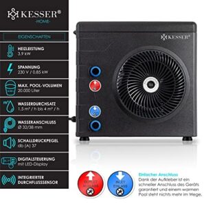 KESSER® Wärmepumpe für Pools bis 20.000 l Wasserinhalt, Heizleistung 3,9 kW, 220V Betriebsspannung, Ø 32/38 mm Wasseranschluss, Durchflusssensor, Digitalsteuerung, Schwarz